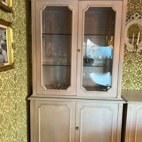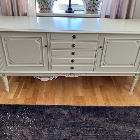 Fin och rymlig skänk i trä med vackra utsmidande detaljer och ben. Färgen är cremevit med en nyans av grått/ rosa i sig.