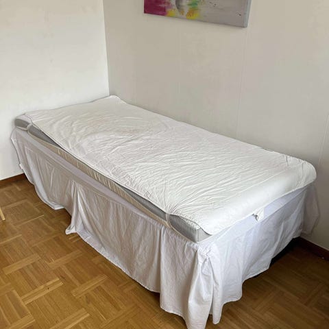 IKEA ribbotten 90-säng i rektangulär modell. Neutralt ljus överdrag med mönstrade kanter. Passar som sängmadrass i sovrum eller gästrum. Kan användas i enkelsäng eller som extra bädd beroende på mått och sängram.