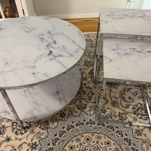 Mio soffbord sats med två runda bord i olika storlekar. Borden har svart marmormönstrad skiva och svart metallstativ. Passar som soffbord eller sidobord i vardagsrum.