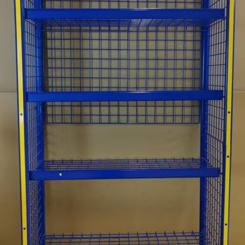 Lagerhyllor bestående av gallerhyllplan i metall samt röda bärbalkar och stag. Passar för förvaring i lager, garage eller förråd. Metallkonstruktion som kan användas för att bygga stabila hyllsektioner för olika typer av gods och material.