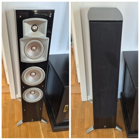Vi ska flytta från stort till smått och kommer löpande lägga upp en mängd varor som vi inte kommer ha med oss, nytt som gammalt. Säljer här Klipsch RF-62 ett par golvhögtalare. Bildcollage för att få med många bilder och om någon vill ha ytterligare någon bild så kan jag ordna det. Begagnade golvhögtalare ifrån amerikanska Klipsch som varit inkopplade på en Yamaha RX-V767 receiver som säljes i en annan annons. Några ytliga repor finns på vissa av sidorna efter barnbarn men inget som påverkar funktionen. Skyddet har alltid varit på och det som syns på högra högtalaren är dropp efter stearin. Möjligt att det går få bort men jag har inte brytt mig. Hornladdad diskant samt dubbla 6,5 tums bas/mellanregister. 97 dB. 4-8 Ohm. 125 Watt RMS 216 × 1031 × 390 mm 24,5 kg/styck. Spikes på sista bilden medföljer.