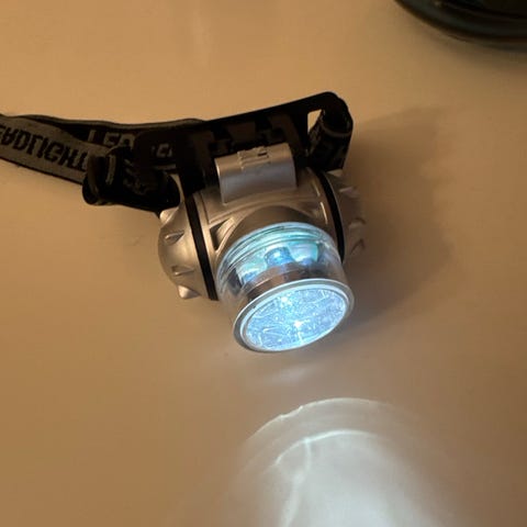 Pannlampa med justerbart elastiskt band i svart. Lampan har en rund ljuskälla framtill med omgivande röd ring och styrknappar på ovansidan samt sidan. Passar för aktiviteter där händerna behöver vara fria, till exempel promenader, löpning eller arbete i mörker.