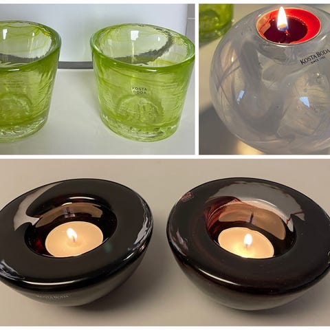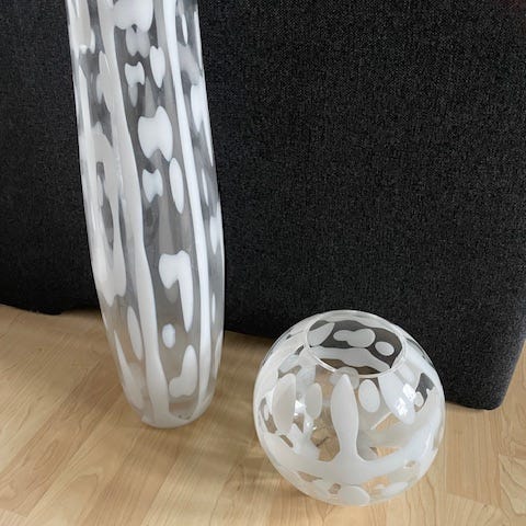 BodaNova glasvas. En högre vas i vitt glas med mjukt rundad, avsmalnande form och en lägre vas i brunmönstrat glas från Olsson&Jensen med rund form. Båda passar som inredningsdetaljer eller för snittblommor och gröna växter.