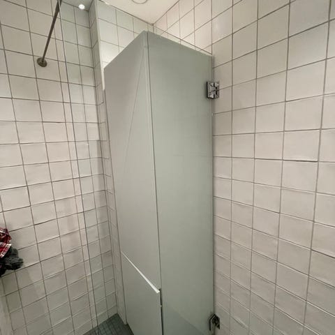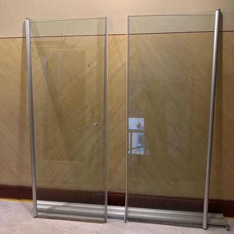 Glasvägg med aluminiumprofiler. Består av glaspartier monterade i vertikala aluminiumramar. Lämplig som rumsavdelare, duschvägg eller annan avskärmning i exempelvis garage, verkstad eller bostad. Exakta mått och glastyp behöver kontrolleras vid intresse.