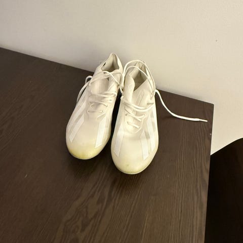 Adidas fotbollsskor utan snörning i vit färg. Skorna har dobbar anpassade för spel på natur- eller konstgräs. Skorna är köpta i höstas och är inte använda särskilt mycket, kunde ej reklamera. Är nämligen för små för mig. Bra skick, inga fel på dom alls. Nypris cirka 2500.