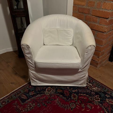 En grå rottingfåtölj från märket Bloomingville. Finns en del synliga skavanker (t.ex. runt "bindningarna"), men som kan fixas till med hjälp av lite färg. Endast estetiska skavanker, fåtöljen fungerar annars som förväntat!