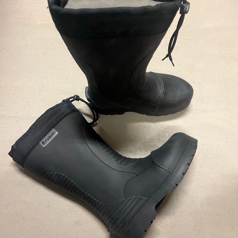 Tyvärr kan min man inte ha stövlarna på sig eftersom han har stödstrumpor nu.