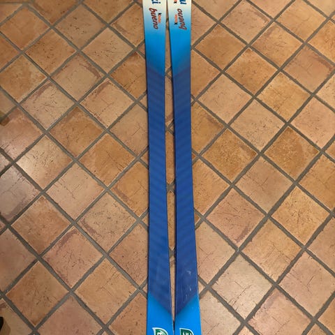 Skidorna har integrerade bindningar i vitt och svart. Längd 165