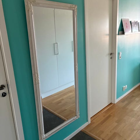 160×70 cm med stuckaturliknande ram (från Rusta), bra skick. Liten skada i nedre kant, se bild