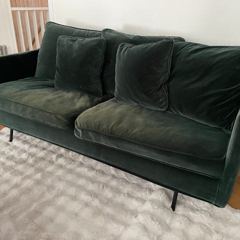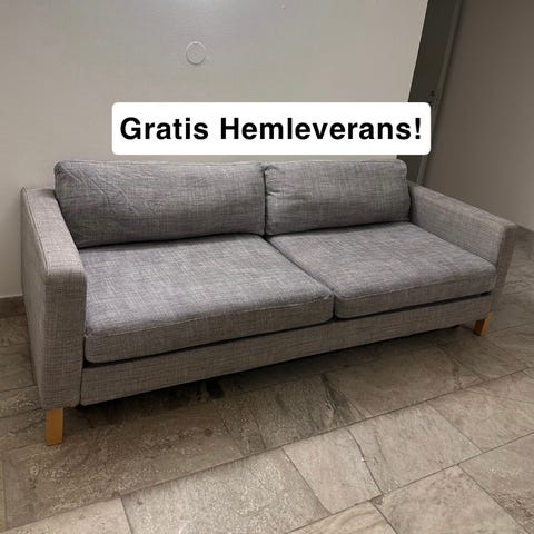 Karlstad 3-sits soffa 204 cm bred, 64 cm hög och 89 cm djup, 5 år gammal men gott skick. Det enda märkbara är att skummet i ena armstödet har flyttat sig lite, se bild. I övrigt varsamt använd, inga fläckar och avtagbar klädsel som kan tvättas i maskin. 800kr.