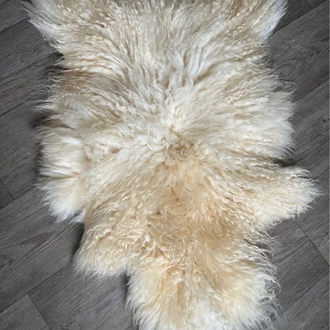 Äkta gotländskt fårskinn i nyskick, köpt i Visby. Fin färg och otroligt fin kvalité.