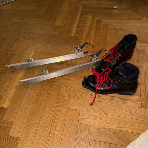 Nästan oanvända svarta långfärdsskridskor i storlek 43 (ej de som syns i bild). Väldigt sparsamt använda, som nya.