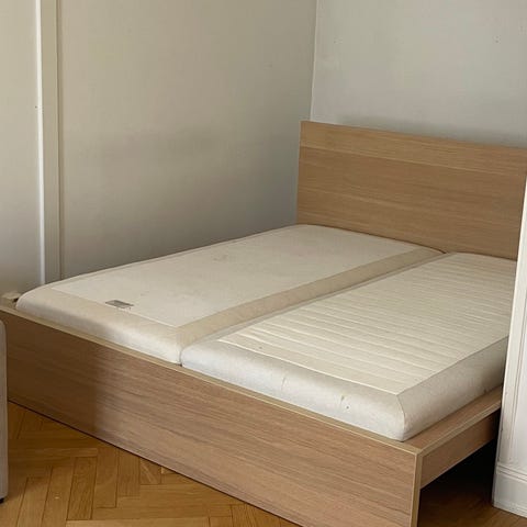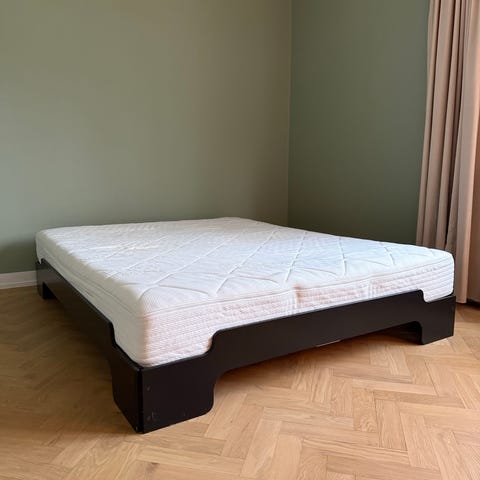 Muji sängram i valnöt med låg profil och japansk design. Ram i massivträ med stålförstärkning och svarvade träben. Ribbotten med träribbor som ger stöd för madrass. Passar bra som bas till 140 säng.