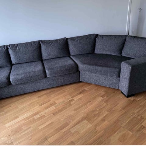 Hörnsoffa med öppet avslut. Blågrå klädsel. Stl 3 m / 2,5 m. Använd i fyra år. Köpt på Hav och Sand i Frillesås. Du får hämta soffan i Lerum. Den är tung men kan delas i två delar. Två personer behövs för att bära.