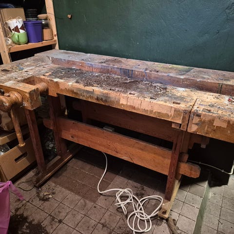 Stor gedigen snickarbänk i trä med kraftig arbetsyta och inbyggda träskruvtvingar framtill och på sidan. Notera: Den på sidan går trögt.