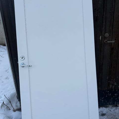 dörrbladets mått är 725x2040 mm. Dörren levereras inplastad. Passar som innerdörr i bostäder eller andra inomhusmiljöer där en slät, vit dörr önskas.