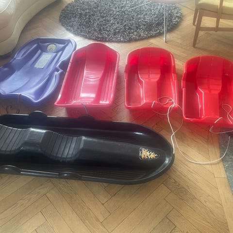 Två stycken retro åkpulkor i plast. Från 60-talet.