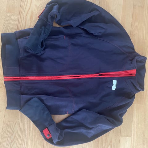 löpartröja för herr i storlek S. Tröjan är blå med neongula partier längs ärmar och vid krage för ökad synlighet. Modellen har halv dragkedja framtill och mudd i ärmslut och nederkant. Passar för löpning och annan träning utomhus.