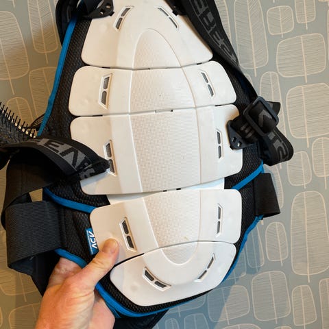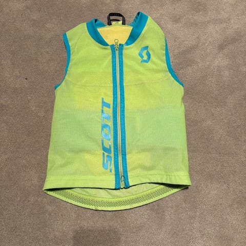 Scott ryggskydd i storlek XS. Rekommenderad kroppslängd 124-140 cm. Skyddet har vit hård ytterplatta med ventilationshål och gröna detaljer. Baksidan har meshmaterial i vitt och grönt med blå kant. Justerbara axelremmar och midjerem ger möjlighet till anpassad passform. Lämpligt som ryggskydd vid exempelvis skidåkning, snowboard eller cykling.