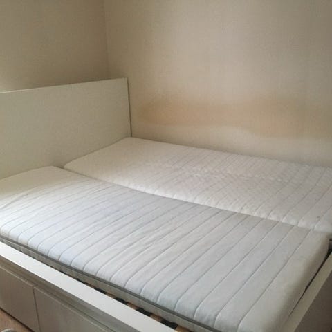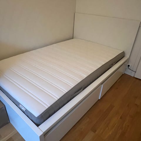 IKEA säng med förvaring i vit färg. Sängen har hög huvudgavel och två utdragslådor under för extra förvaringsutrymme. Ytskikt i vitlackad träskiva. Ingår madrass. Sängen är 120x200 cm.