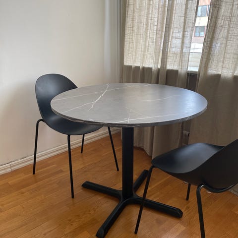 Ett matbord från IKEA som har namnet MARIEDAMM. Den är mörkgrå, 105 cm i diameter och 75 cm i höjd.