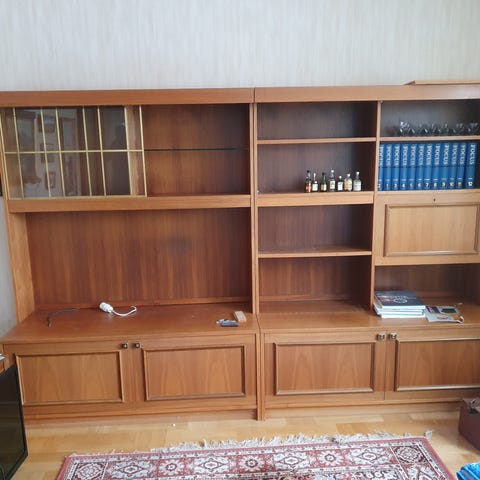 Bokhylla i 4 sektioner. Bredd 100cm med skåp och bredd 60cm med lådor. Underdel höjd 70 cm och djup 45cm. Överdel djup 26cm. Totalhöjd ca 190cm. Tillverkad av AB Svenska Möbelfabrikerna i Bodafors.