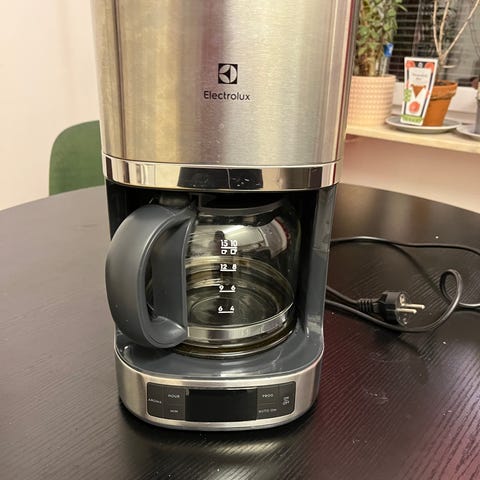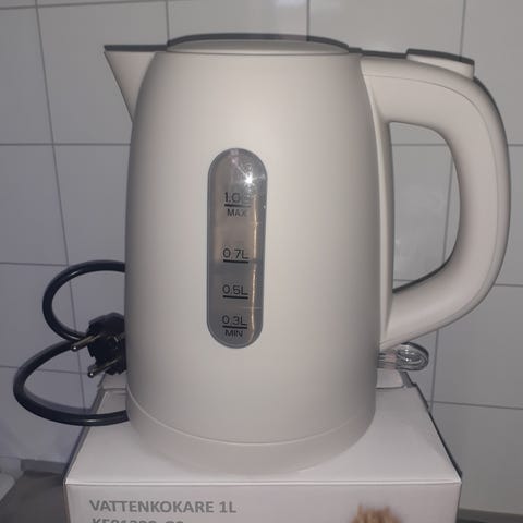vattenkokare i vit färg. Elektrisk modell med separat basplatta och sladd. Kannan har handtag upptill och pip för enkel upphällning. Passar för uppkokning av vatten till te, kaffe och matlagning i kök eller kontor. Aldrig använt och är gjord av glas