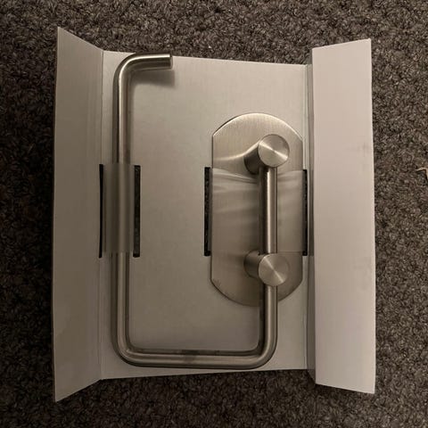 Toalettpappershållare med integrerad förvaringslåda i rostfritt stål. Väggmonterad modell med lock och hylla/fack ovanför hållaren för extra förvaring, till exempel våtservetter eller små hygienartiklar. Den är designad för väggmontering och levereras med instruktioner för installation utan borrning. Storleken visas på sista bilden. Helt ny
