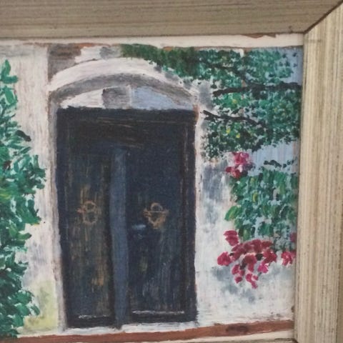 Tavla med motiv av en färgstark, upplyst port i blå och lila toner. Verket är inramat i en mörk ram. Passar som väggdekoration i exempelvis vardagsrum, hall eller kontor.