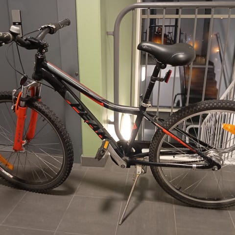 framgaffel med dämpning, och fälgbromsar, pakethållare bak, stänkskärmar fram och bak, stöd och flaskhållare. Passar för vardagscykling och enklare terrängkörning.