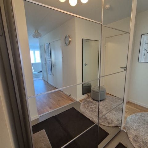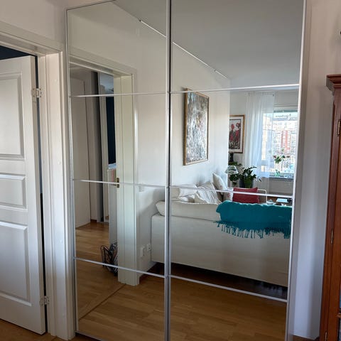 Pax garderob 150x 236cm med spegelglas skjutdörrar med hyllor. Garderoben är fint skick inga synliga skador. Djurfritt och rökfritt ingår alla inredningar. Transport möjligt