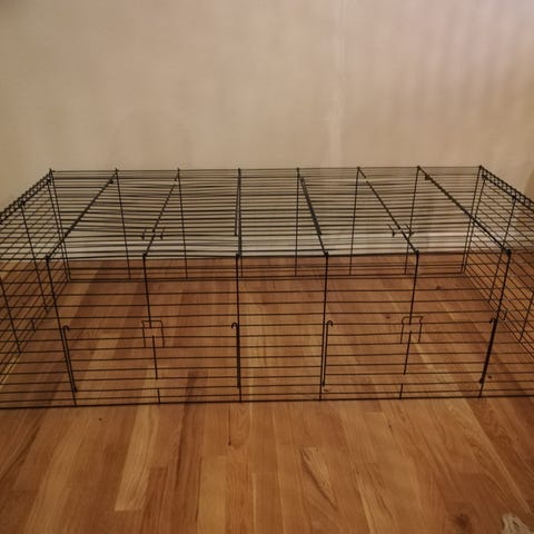 Bur i vitlackerad metall med plastbotten. Plastbotten är slät och lätt att rengöra. Buren är i bra men använt skick, enligt bilderna. Hela buren har måtten L:150 cm x B:75 cm x H:63 cm. Bottendelen har 24 cm höga kanter. Gallerhyllan är borttagbar. (Vi tyckte det var fiffigt med badrumsmattor som underlag på hyllan åt våra marsvin). Hela taket kan också tas av om man vill ha öppet ner till buren.