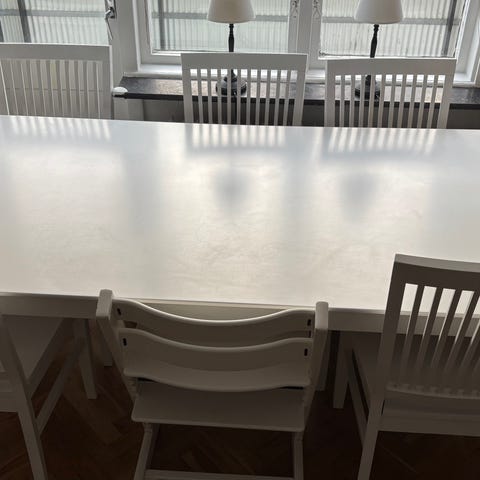 Bordet har använts mycket och det är skadat på två ställen. En av stolarna har en skada (se bilder). I övrigt är bord o stolar i gott skick.