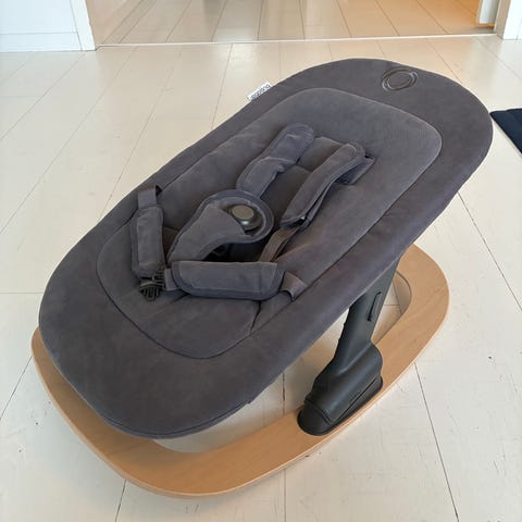 BabyBjörn Bliss babysitter i beige mesh-tyg. Babysittern har ett ventilerande nätmaterial och en stabil metallram. Utrustad med trepunktssele och justerbart läge för barnet. Tyget är avtagbart och kan tvättas enligt tillverkarens anvisningar. Passar för spädbarn och mindre barn inom den vikt- och åldersgräns som anges av BabyBjörn.