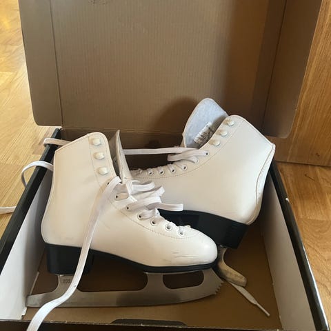 Skridskorna har klassiska konståkningsskär med tåtagg framtill och svart klack. Levereras i originalkartong. Skridskosskydd medföljer!