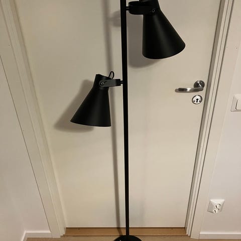 Golvlampa i svart färg. Köpt på confidentliving.se (se bild för kvitto & pris). Smal och minimalistisk design med tre ben och justerbar lampskärm.