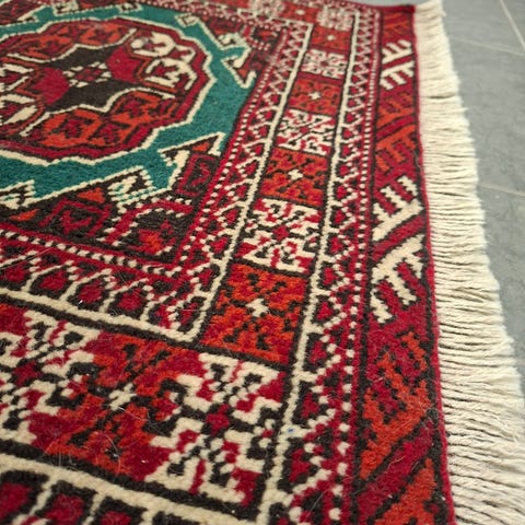 Säljer en äkta handknuten hallmatta i klassiskt orientaliskt mönster med röd botten och vackra detaljer i grönt, beige och svart. En kompakt och dekorativ matta som passar perfekt i hallen, vid sängen eller som accent i ett mindre rum.