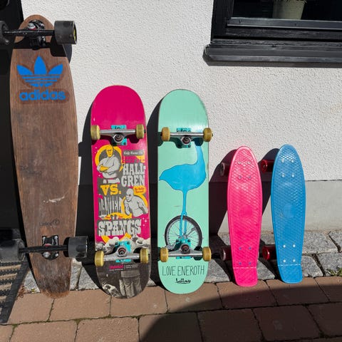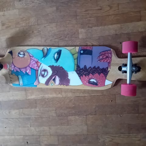 Skateboard i mycket bra skick – knappt använd (endast 3–4 gånger). Inga större repor eller skador och den rullar bra.