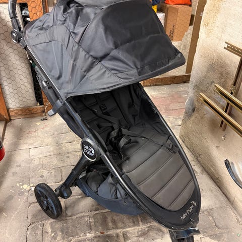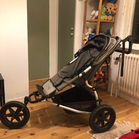 Mountain Buggy joggingvagn i svart färg. Vagnen har tre större lufthjul, varav ett svängbart framtill, vilket underlättar körning på olika underlag. Sittdelen är rymlig med sele och fotstöd. Handtaget är vadderat och det finns varukorg under sittdelen för förvaring. Passar för promenader och löpning med barnvagn på varierande underlag.