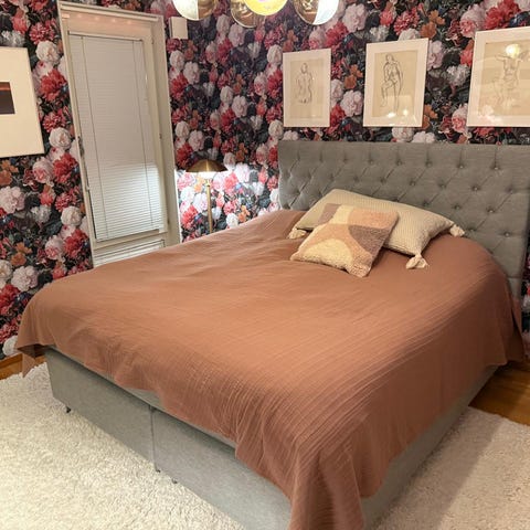 Inklusive sänggavel i samma tyg som sängen.