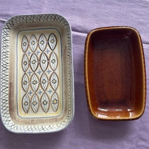 Faten är blå med dekorativt geometriskt mönster i kontrastfärg på ovansidan.
