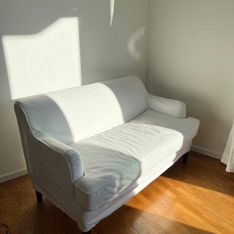 IKEA soffa Vimle i 2-sitsmodell med rak, modern form. Klädd i grått tyg med två sittdynor och två ryggkuddar. Breda armstöd och låg rygg. Passar som sittmöbel i vardagsrum, gästrum eller mindre utrymmen där en kompakt soffa behövs.