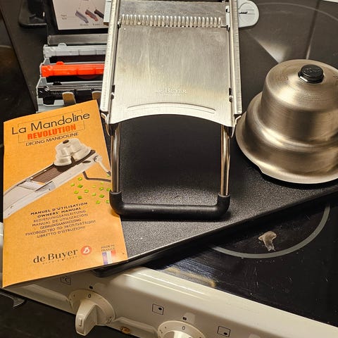 Multifunktionell Mandolin från Mastrad med flera olika blad för att skiva, strimla och riva grönsaker. Använd en gång.