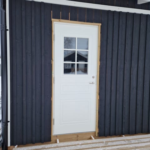 Ytterdörr Diplomat ”Maj”inklusive handtag och lås med 5 nycklar. Färgkoden är RAL6003. Dörren har varit monterad några veckor i vårt nya hus då vi fick fel färg på dörren. Finns en del svart färg på karmen efter husmålning men kan täckas av dörrfoder.