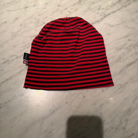 Polarn O. Pyret randig röd barnmössa i storlek 56/58, motsvarar ca 9 - 12 år. Material: 100% bomull. Nämnd.