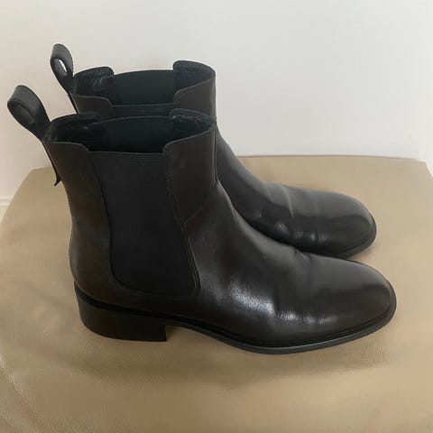 Ecco stövlar i svart skinn i storlek 40. Kortare modell med låg klack och resårpartier på sidorna för enklare av- och påtagning. Ovandel i läder och yttersula i gummi. Passar som vardagsstövlar under höst och vinter.