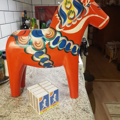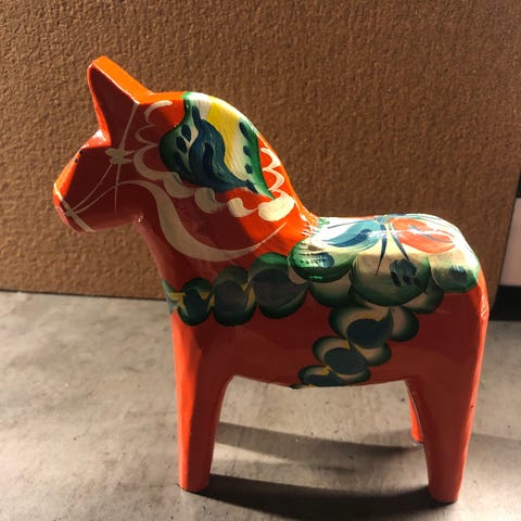 Nils Olsson dalahästar i trä, set om tre stycken. Hästarna är handmålade i traditionella kurbitsmönster i olika färger: två i rött och en i blått. Tillverkade i trä med blankmålad yta. Passar som prydnad eller samlarföremål. Märkningar undertill visar tillverkare och ursprung från Nusnäs, Sverige.