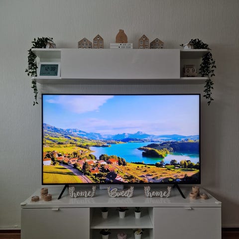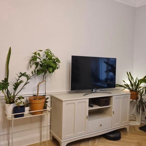 Snygg och modern TV-bänk i vitt och grått med glasdetalj och LED-belysning. Två skåp så det är gott om förvaring och passar perfekt i vardagsrummet.