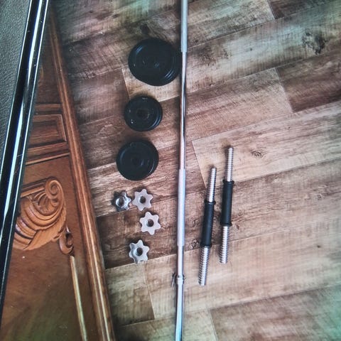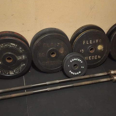 Casall skivstång med viktskivor i svart färg. Setet inkluderar en rak skivstång i metall, fyra viktskivor med handtag samt snabblås för att säkra vikterna på stången. Passar för styrketräning som bänkpress, marklyft, knäböj och andra basövningar i hemmagym eller träningsrum.