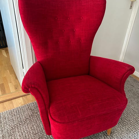 En röd Ikea strandmon fåtölj och fotpall i mycket fint skick, knappt använd.